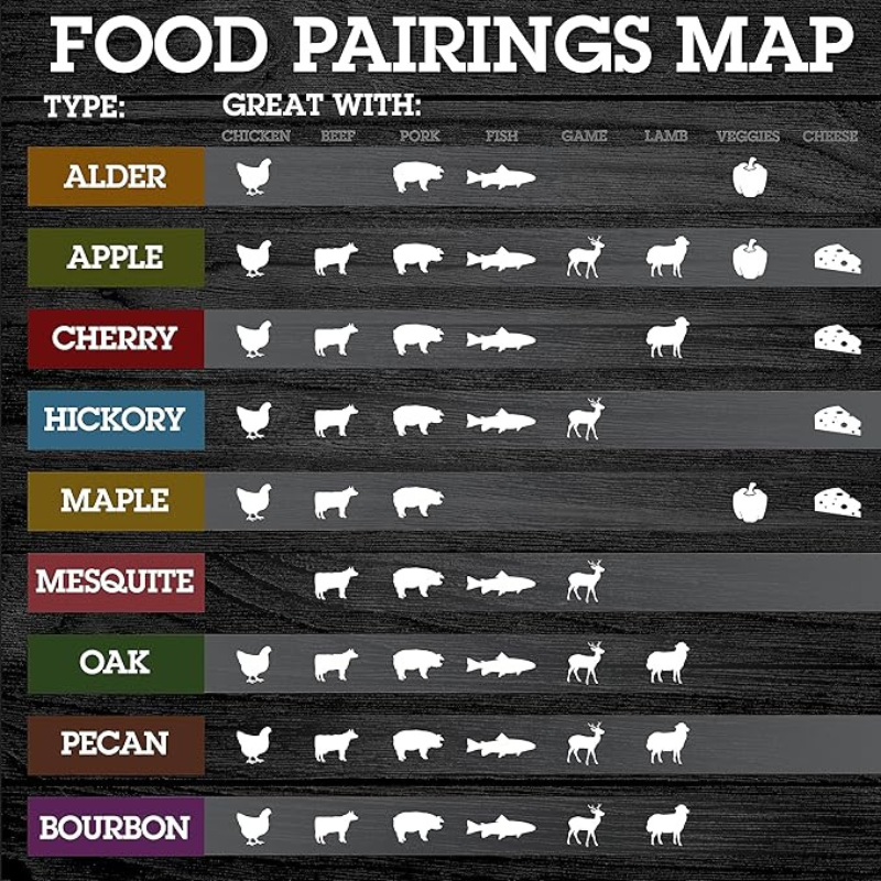 Amazing with: Apple is a mild fruitwood that compliments a wide range of foods. Apple wood chips pair well with poultry, beef, pork, seafood, lamb, game, veggies, and cheese!