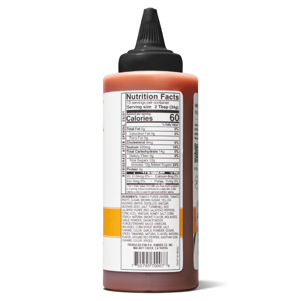 Ingredients: Tomato Puree (Water, Tomato Paste), Sugar, Brown Sugar, Yellow Mustard (Water, Distilled Vinegar, Mustard Seed, Salt, Turmeric), Red Jalapeno Puree (Red Jalapeno Peppers, Citric Acid), Vinegar, Honey, Salt, Corn Starch, Natural Smoke Flavor, Molasses, Garlic Powder, Onion Powder, Worcestershire Sauce (Vinegar, Molasses, Corn Syrup, Water, Salt, Caramel Color, Garlic Powder, Sugar, Spices, Tamarind, Natural Flavor), Natural Flavor, Ground Red Pepper, Xanthan Gum, Caramel Color, Spices.