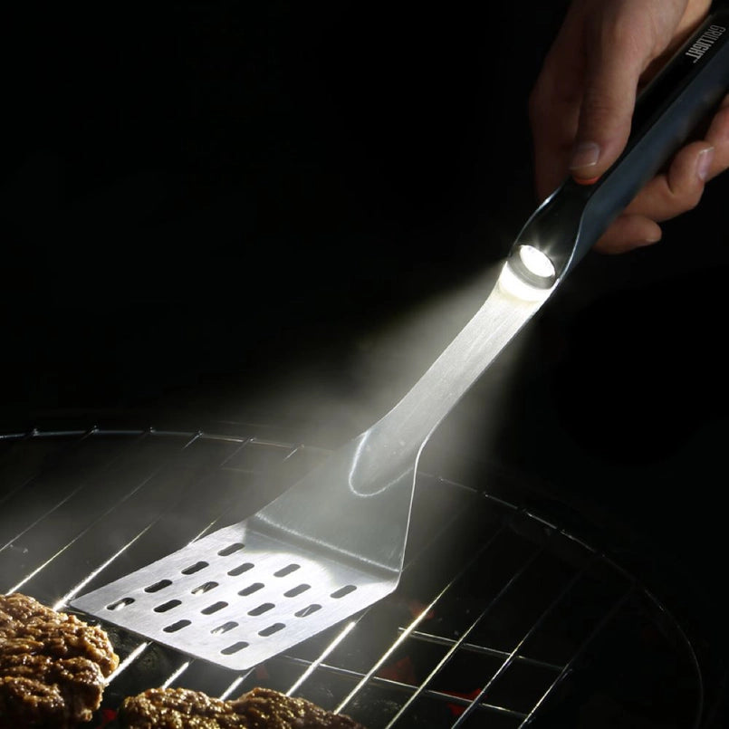 The built in 200 Lumen LED flashlights in the spatula and tongs are bright enough to light up any grill. Never worry about grilling in low-light conditions again! The LED lights are built into the tools and always point exactly where you need them. With their patented Ideal Illumination technology, you'll always see the true color of your food.