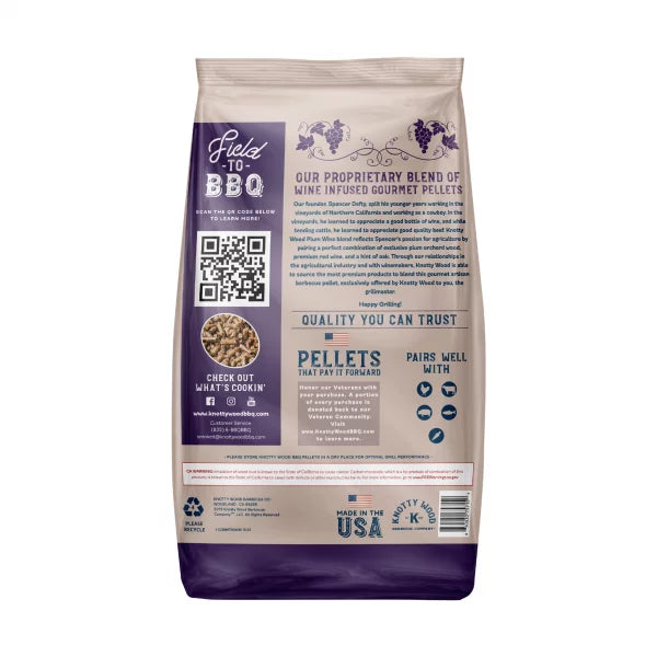 About: Knotty Wood Plum Cabernet Wine blend pellets were created by pairing a perfect combination of exclusive plum orchard wood, cabernet wine, and a hint of oak.