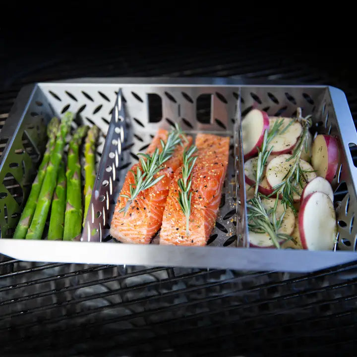 Crafted from heavy-duty stainless steel and built to last, this generously sized 12" x 7.5" grill basket features two adjustable dividers with five customizable positions, allowing you to separate and organize your ingredients just the way you like them. Whether you're keeping shrimp away from steak or giving delicate veggies their own zone, this basket puts precision grilling at your fingertips.